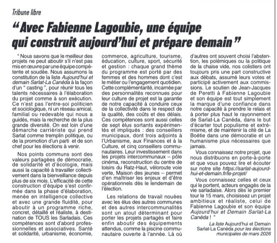 Tribune de la liste Aujourd’hui et Demain pour Sarlat-La Canéda, parue dans L’Essor Sarladais du 20 février 2026 :